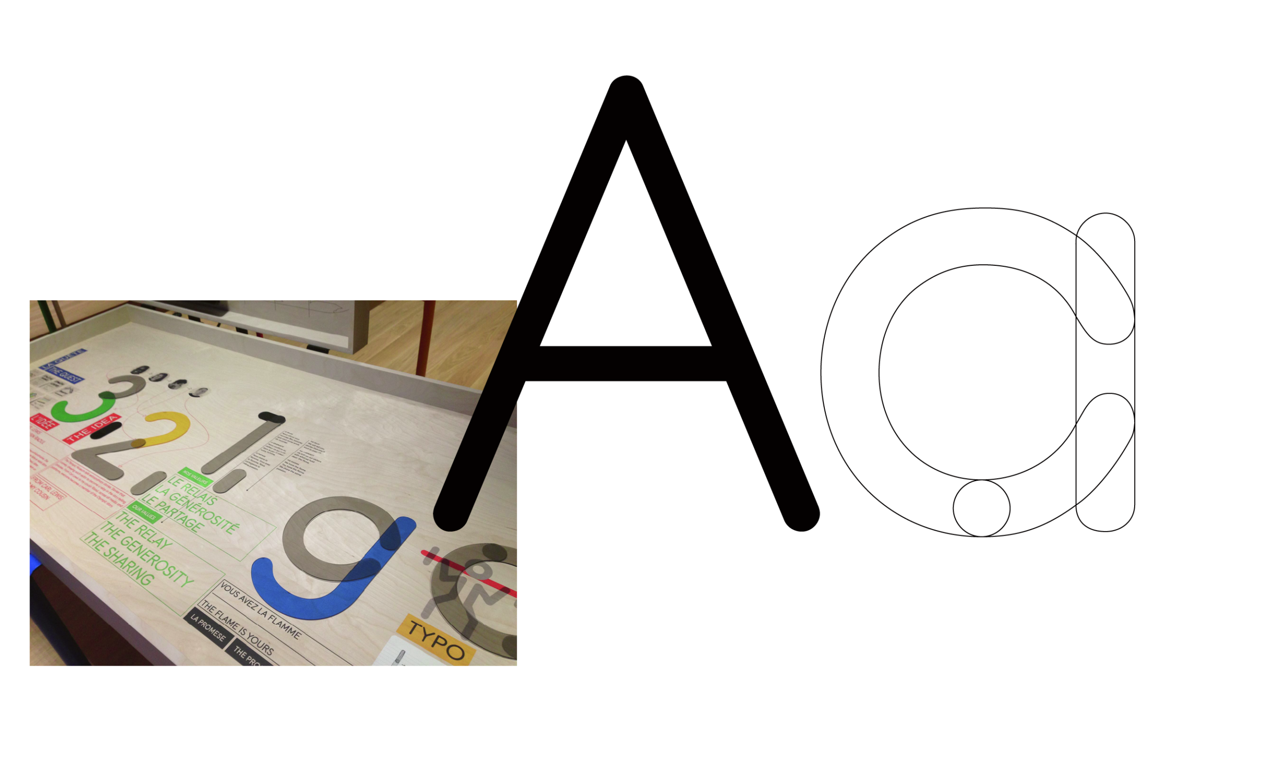 L’idée initiale du relais est traduite sur cette fonte par le découpage des caractères qui permet de faire des liaisons dans ceux-ci avec une superpositions de couleurs. Le choix de caractères arrondis offraient la meilleure solution pour jouer sur les liaisons, et fait aussi echo aux anneaux olympique.